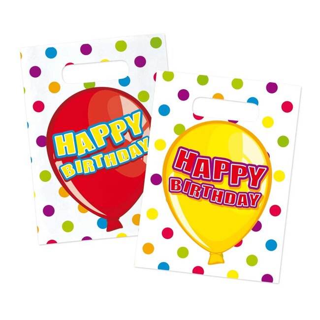 Happy Birthday Uitdeelzakjes - 6 stuks. Inhoud: 6 uitdeelzakjes. Kleur: Meerkleurig. Bijvoorbeeld te gebruiken tijdens de volgende feestgelegenheid/feestgelegenheden: verjaardag, kinderfeestje. De zakjes zijn 17 cm hoog en 23 cm breed. Het artikel is gemaakt van plastic.