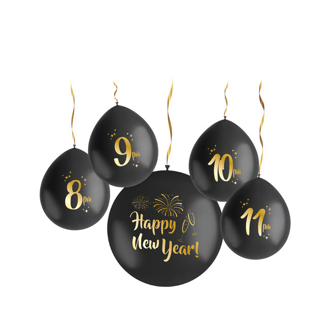 Knallend het jaar uit! Latexballonnen, Countdown Set, BlackGold HNY, 5 stuks. Inhoud: 5 ballonnnen. Bijvoorbeeld te gebruiken tijdens de volgende feestgelegenheid/feestgelegenheden: Oud en Nieuw. Met deze latex ballonnen countdown set is het vanaf 20.00 uur elk uur knallend aftellen naar 0.00 uur. Het idee is dus dat elk uur een ballon wordt lekgeprikt. De set bestaat uit 4 latexballonnen van 33 cm (met daarop de 24-uursnottaties: 8pm, 9 pm, 10pm en 11pm) en 1 ballon van 61 cm mèt confetti (met daarop 'Happy New Year') Er zitten plastic touwtjes bij om de ballonnen op te hangen. Alle 5 ballonnen zijn zwart met een gouden opdruk aan één kant. Dit artikel is gemaakt van latex.