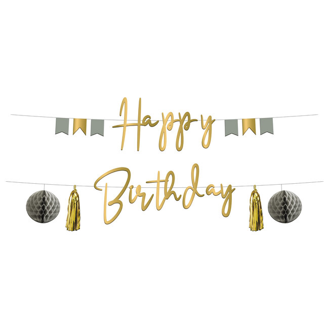 Letterslingers Golden Dawn - 1,5 meter. Inhoud: 2 letterslingers. Kleur: Goudkleurig. Bijvoorbeeld te gebruiken tijdens de volgende feestgelegenheid/feestgelegenheden: Verjaardag en Kinderfeestje. Elke slinger is 1,5 meter lang en eenzijdig bedrukt. De tassels zijn ongeveer 22cm lang en de honeycombs hebben een diameter van ongeveer 13cm. Het artikel is gemaakt van papier.