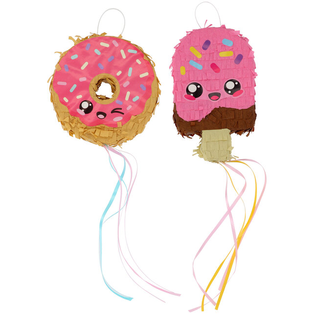 Té cute om kapot te slaan! Deze Mini Piñata Set – Avocado & Watermeloen brengt schattigheid naar elk feestje. De set bevat 1 mini avocado piñata en 1 mini watermeloen piñata, beide voorzien van lieve gezichtjes die elk kinderfeestje, verjaardag of themafeest compleet maken. De donut-piñata is 15x15x5 cm en de avocado-piñata 20x12x5 cm. Beide piñata's zijn gemaakt van stevig karton, hebben een plastic ophanglus en een afgedekte opening om gemakkelijk te vullen. Dankzij het open venster in de verpakking zijn ze niet alleen mooi zichtbaar, maar ook voelbaar. Een perfecte aanvulling op de Kawaii Party collectie.