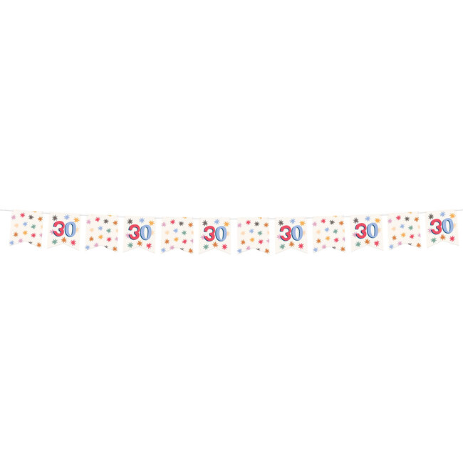 30 jaar! Dat moet gevierd worden. Vlaggenlijn - 30 - Starburst - 6 meter. Inhoud: 1 vlaggenlijn. Bijvoorbeeld te gebruiken tijdens de volgende feestgelegenheid/feestgelegenheden:Verjaardag, Jubileum. Een vrolijke vlaggenlijn vol kleurige sterren om iedere 30-jarige mijlpaal mee te vieren. Er zitten 16 vlaggen van 21 x 18 op deze 6 meter lange vlaggenlijn. De vlaggen zijn dubbelzijdig bedrukt en hebben om en om het Starburst patroon en het cijfer: "30". Ze kunnen heen en weer worden geschoven over het witte lint. Deze vlaggenlijn hoort bij de Starburst collectie van Folat. Dit artikel is gemaakt van FSC papier.